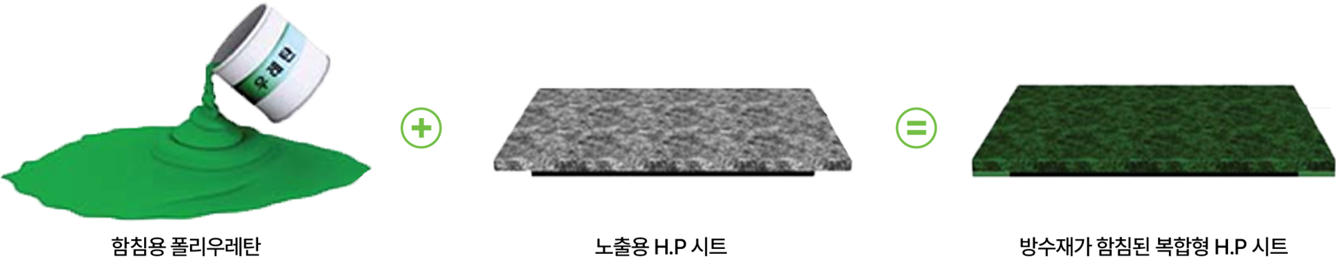 하이방수는 고분자 PVC계 합성수지시트(PVC시트)와 저융점섬유(LMF)가 함유된 합성섬유시트를 열융착시켜 만든 H.P시트에 함침용 우레탄을 함침시키는 기술을 이용하는 방수 공법입니다.