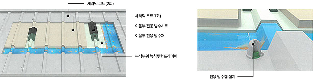 내구성 증대 이음부 부위의 전용 방수시트 + 전용 방수재의 2중 보강